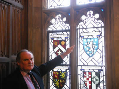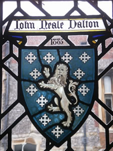 From Michael Neale Dalton, Chairman and Honorary Life President of the Dalton Genealogical Society During September 2008 Michael & Kate Dalton visited St George’s Chapel, Windsor and whilst there they were shown the window that commemorates John Neale Dalton as a Canon of Windsor from 1884 until his death in 1931. Here Michael describes the visit and provides some interesting background on Canon Dalton. It was on a rather wet day in early September 2008 that we found ourselves on a visit to St George’s Chapel, Windsor, primarily to view the magnificent stained glass in this wonderful old building that sits within the precincts of Windsor Castle and is the home of the Order of the Garter founded by Edward III in 1348. Whilst there we enquired whether it might be possible to view the Canon Dalton memorial window in the Chapter Room, which is in a private part of St George’s not open to public view. Many years ago this window was brought to my attention by a friend, who saw it and photographed it for me whilst visiting St George’s in his professional capacity as an audit accountant. We were most fortunate that the Chapter Clerk, Miss Charlotte Manley, invited us to see the window and re-photograph it. The photographs below are reproduced on this website by kind permission of the Dean and Canons of Windsor. Michael Dalton points to the Chapter Room window with Canon Dalton's Coat of ArmsDetail of the stained glass window with Canon Dalton's Coat of ArmsDuring our time with Miss Manley we asked about other memorials to Canon Dalton at St George’s and she looked up in the book that records the details of the monuments in the chapel and found entry number 82, which reads as follows: DALTON, JOHN NEALE, Canon 1931 DALTON, CATHARINE ALICIA 1944 JOHN NEALE DALTON, Pavement, South Choir Aisle. Not signed. Description. Black stone slab, 24 in x 33 in We were then shown this monument, inconspicuously placed in the South Choir Aisle, only to discover that we had walked over it earlier in the afternoon without knowing anything about it! What a wonderful day of discovery we had been fortunate enough to enjoy. The full story of Canon Dalton is a long and interesting one and it is planned to include a more in depth article about him in the next issue of the DGS Journal. This will give an insight into his long and often colourful life. It was as long ago as 1973 that there was something written in the Journal about him (DGSJ Vol 4 pp 15-20). He was the son of Rev John Neale Dalton, Rector of Milton Keynes, a grandson of John Dalton and Hannah Neale, and the father of Hugh Dalton, who became Chancellor of the Exchequer in the Labour government after the Second World War. He was appointed by Queen Victoria as the tutor to the two Royal Princes, her grandsons, as recorded on the monument. I conclude this note with an extract from "The Dalton Book" by Frances Edith Leaning (nee Dalton), a first cousin once removed of the Canon, who attended his funeral service in St George's Chapel: On Monday evening, July 27, 1931, Canon Dalton read