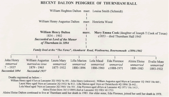 own means b. America (Brit. Subj.) Another daughter, Liila Marion, born in Buenos Ayres on 25th July 1880, had died aged 16 years at Bournemouth on 28th December 1896, and her death was registered at Christchurch Registry Office. She was buried in Wimborne Road Cemetery, Bournemouth, by John Patterson, Clerk, Curate of St Ambrose, Bournemouth. The last entry I could find for the family was at the same address in the Visitors Directory for 2nd April 1902. The property then passed into the ownership of Mr. E. H. Mooring Aldridge, a well known local solicitor. Mary Emma Dalton died at Thurnham Hall on 6th June 1945 and was buried at Lancaster Cemetery. The departure of the family from Westbourne was probably brought about by the death of William Henry in 1902 at Thurnham. His body was brought to Bournemouth for burial beside his daughter, Lilla, in the Wimborne Road Cemetery. The internment took place on 16th May 1902 and was performed by Charled Edward Gollen, Clerk. (The headstone, depicting an angel supporting a cross stands today). The eldest son, John Henry, succeeded to the estate implementing some refurbishment to the property and was followed after his death in 1937 by his brother, William Augustus, who died in 1965. The estate then passed to the eldest surviving sister, Eda Florence, and after her death in 1971 to Alzira Eloise Dalton who continued living at Thurnham Hall until she moved into a cottage on the estate where she died in 1983. The ancient link with the Dalton family came to an end with the purchase of the Hall by Mr. And Mrs. Stanley Crabtree who carried out extensive refurbishment to the property. I had little idea when visiting Thurnham for the first time at the DGS Lancashire Gathering in 2004 that members of the Thurnham Daltons had for a time resided just a few yards from my present home close to Westbourne and a short distance from the house called 'Skerryvore' (bombed in the Second World War but now kept as a memorial garden) where between the years 1884-87 Robert Louis Stevenson wrote “Dr Jekyll and Mr Hyde” and “Kidnapped”! Recent Dalton Pedigree of Thurnham Hall |