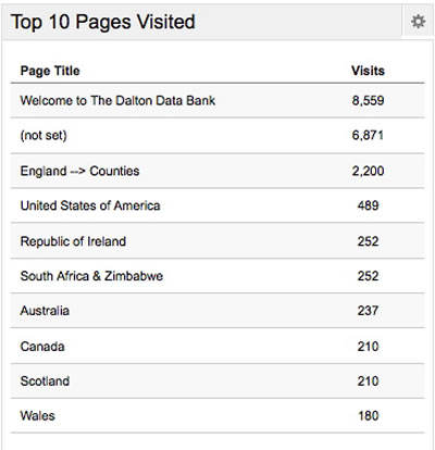 Members. DGS Web Site Usage Statistics: 1,482 Visits from 54 Countries / Territories DGS Web Site Usage Statistics Top 10 pages visited Visits by date Google Ad Campaigns: Dalton Data Bank Site: 15,335 Visitors reached the Data Bank by clicking on one of the 2,043,140 Google Ads served during the reporting period. We have started a "Join Us" Ad Campaign for the DGS site. Here are the results for the reporting period: 27 Visitors reached the DGS UK Site by clicking on one of the 9,138 Google Ads served during the reporting period. That's all until next month. Wishing you all a wonderful summer! Karen Dalton Preston |
