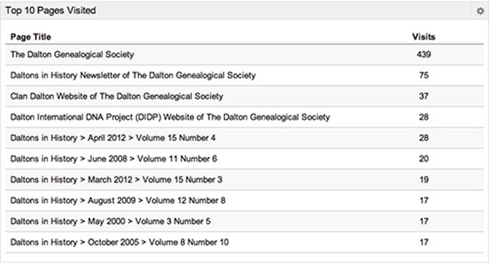 My goodness, where does the time go? 2012 can't possible be half over, but it is. Here in Las Vegas, we are settling into our summer heat, so David and I are trying to spend as much time as possible in the cool indoors. This is great for doing genealogy, however - I am definitely motivated to stay at my desk in the air-conditioning. June seems to be the official start of summer, and the beginning of summer vacations. As you plan your summer travel, if you will be doing any family history research, or traveling to any Dalton-related places, please take lots of photos and share your travels with us by submitting photos and a few words. We'd all love to see where you've been! A New Coordinator for Genetic Family A: I am pleased to announce that Melanie Crain of North Carolina will be replacing me as the Group Coordinator for Genetic Family A within the Dalton International DNA Project (DIDP), effective this month. Those of you who are members of Group A will know that Melanie has spent several years researching the origins of the Virginia Daltons, and documenting the various Dalton family trees within this large Genetic Family. She is also very familiar with the challenges of finding a connection between the various Dalton family lines among the Group A testees, and the search for the distant origins of the Common Ancestor. Many of you have seen her excellent presentation on the Albemarle Daltons that was presented at the 2011 DGS Gathering in Salt Lake City, and can be viewed on the Dalton Data Bank web site at http://www.daltondatabank.org/SLCPresentations.html. Genetic Family A continues to be the largest genetic family within the DIDP. In 2009, the DNA Project had 120 members, with over one third of the testees falling into Group A. The Project now includes 163 testees, of whom 49 are members of Group A. My own Dalton ancestry is part of the "Golden Vale" Irish Daltons in Group D. When I assumed the role of coordinator for Group A in 2009, it was always my intention to pass the baton to someone among the Group A genetic cousins who would be more familiar with the Group's ancestry. Happily, Melanie will now take on this role. I will continue to work with Michael Neale Dalton as co-Adminstrator of our Dalton International DNA Project, and as the Family Coordinator for Genetic Family D. If anyone has questions about testing, about the DNA Project, or just needs more info, please email me at karen@golden-hills.com. . . . and a word from Melanie Crain Melanie Crain It is a pleasure and a privilege to work with the Family Group A in the Dalton International DNA Project, and I thank Karen for asking me to take on this responsibility. While the colonial Virginia Daltons are not the earliest Dalton line in colonial America, our ancestors came here almost three hundred years ago. Now, to find out, if we can, who the common ancestor(s) are. With your help, it is possible. Activity on Facebook: There has been a great deal of Dalton family activity on Facebook in the last month. As I wrote in the April edition of "Daltons in History", the descendants of David Dalton, Sr. (part of the Albemarle Daltons) have created a group page on Facebook. Recently, several members of the group have posted old family photos that relate to the extended family of the Dalton Gang. Even if your Dalton lineage does not include the Dalton Gang, it is very interesting to see the old photos. Do you see any family resemblance? If you are on Facebook, you can take a look at the recent activity at - http://www.facebook.com/groups/daviddaltonsr/ And, I am pleased to see that we have a new member in the DIDP who found us through Facebook. He believes that the DNA testing will confirm that he is related to the Virginia Daltons, and will be a match to Group A in the DIDP. Now for the usual business of the month: Web Sites Update: For the period from 1 May, 2012 to 31 May, 2012 Updates to the Data Bank: 11 May, 2012: Boston, Massachusetts - Added 1837 Edward Dalton Marriage Contributed by Chuck Brown, Illinois 5 May, 2012: Dalton Chronicles - Mary Emma Cook of Thurnham Hall Contributed by Rodney G. Dalton, Utah Special Site Addition: In compliance with the new UK / EU Law requiring websites to inform users of the use of browser cookies, we have added a pop-up that explains how we use this information, and allows the Visitor to either accept our cookies, or to go back to the page they previously visited. DDB Web Site Usage Statistics: 19,828 visitors came from 104 Countries / Territories DDB Web Site Usage Statistics Top 10 pages visited Visits by date Dalton Forum: There are a total of 282 Posts in 176 Topics by 391